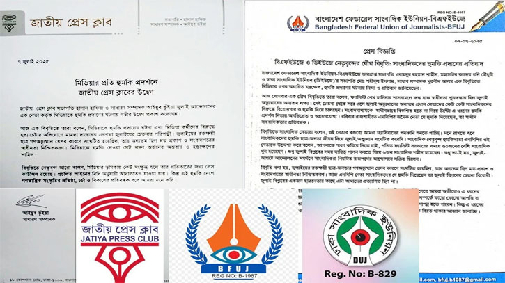 জাতীয় প্রেস ক্লাব, বাংলাদেশ ফেডারেল সাংবাদিক ইউনিয়ন (বিএফইউজে) এবং ঢাকা সাংবাদিক ইউনিয়ন (ডিইউজে) যৌথভাবে এক বিবৃতিতে গণমাধ্যমের ওপর অযাচিত হস্তক্ষেপ ও হুমকির ঘটনার তীব্র নিন্দা, প্রতিবাদ এবং গভীর উদ্বেগ প্রকাশ করেছে।