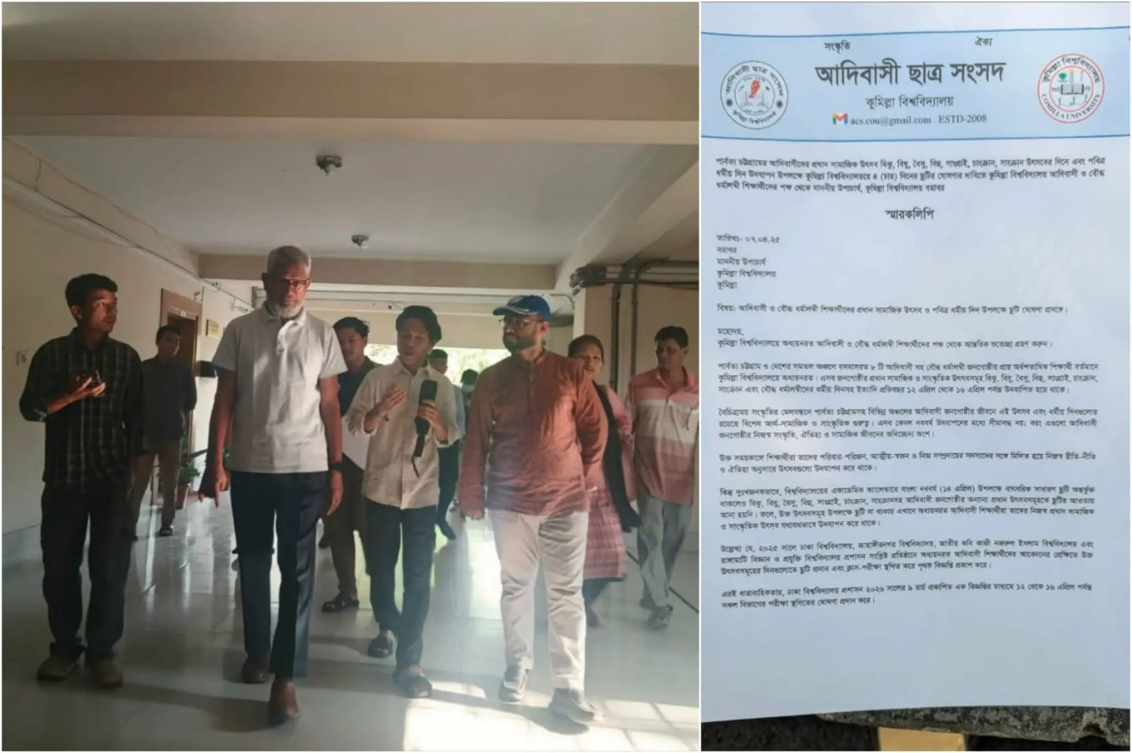 বৌদ্ধ ধর্মাবলম্বীদের পবিত্র ধর্মীয় উৎসব বিঝু, বৈসু, সাংগ্রাই, চাংক্রান ও সাংক্রান উপলক্ষে প্রতি বছর ১৩–১৬ এপ্রিল বিশ্ববিদ্যালয়ে ছুটি ঘোষণার দাবিতে কুমিল্লা বিশ্ববিদ্যালয়ের (কুবি) উপাচার্য অধ্যাপক ড. মোঃ হায়দার আলীর কাছে স্মারকলিপি দিয়েছে আদিবাসী ছাত্র সংসদ।